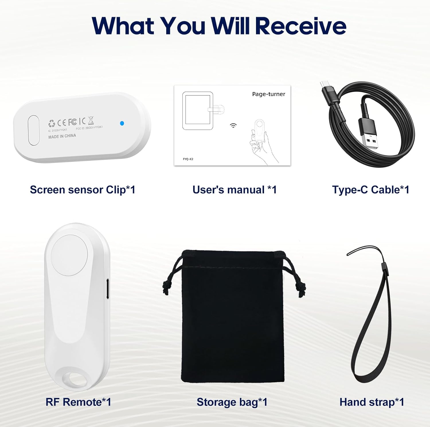 Rechargeable design eliminates battery replacements. With typical 3.4 hours of reading use, the Screen Sensor Clip can last up to 1 month on standby, while the RF Remote can last up to 3 months. Includes Screen Sensor Clip, RF Remote, Type-C Cable, Manual, Storage Bag, and Hand Strap.